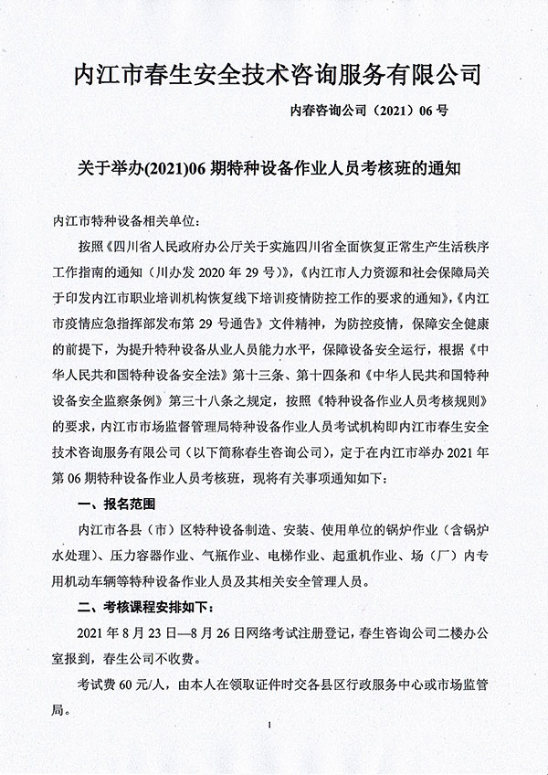 2021年春生公司06期特種設備作業(yè)人員考核班通知