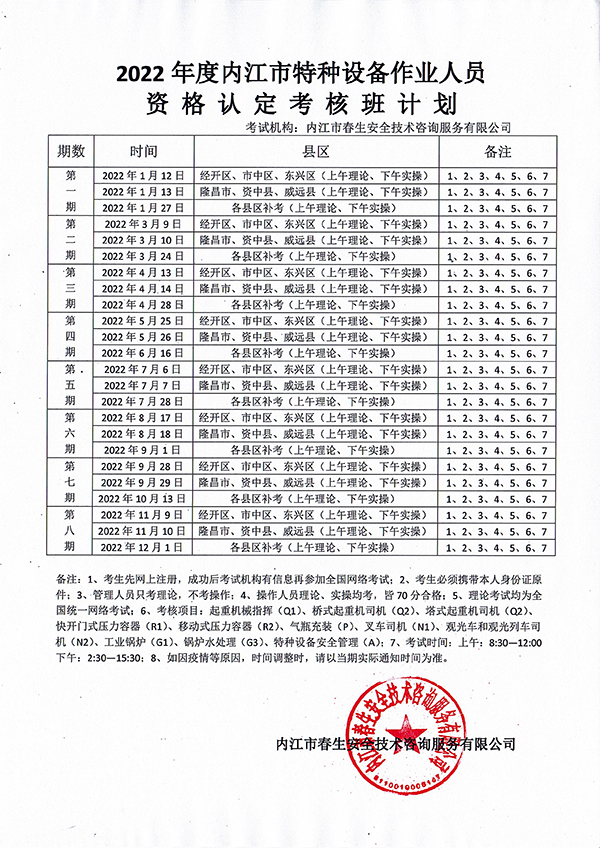 2022年春生公司05期特種設(shè)備作業(yè)人員考核時(shí)間安排