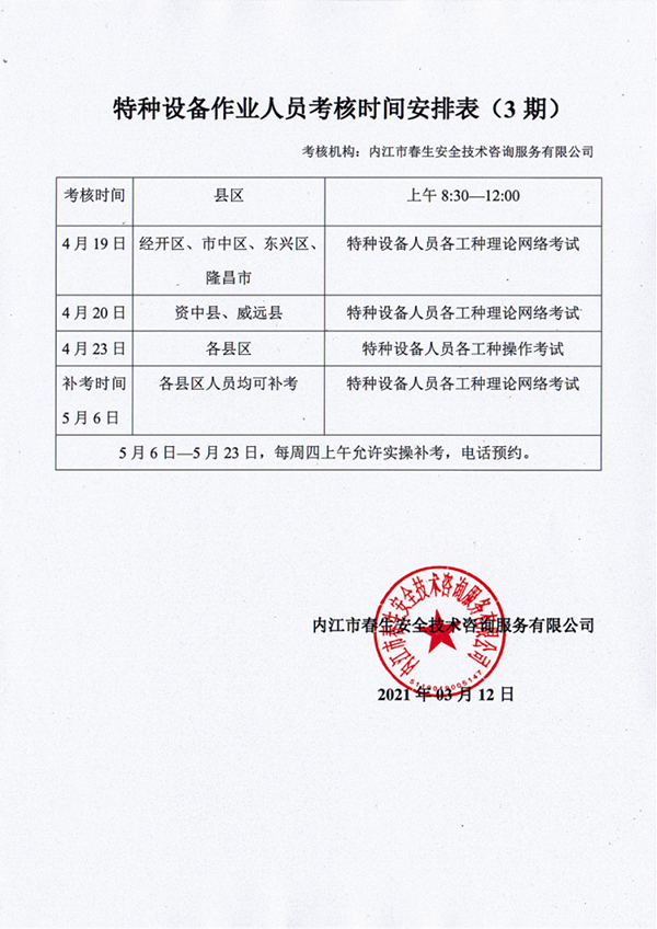 2021年春生公司03期特種設備作業(yè)人員考核時間安排
